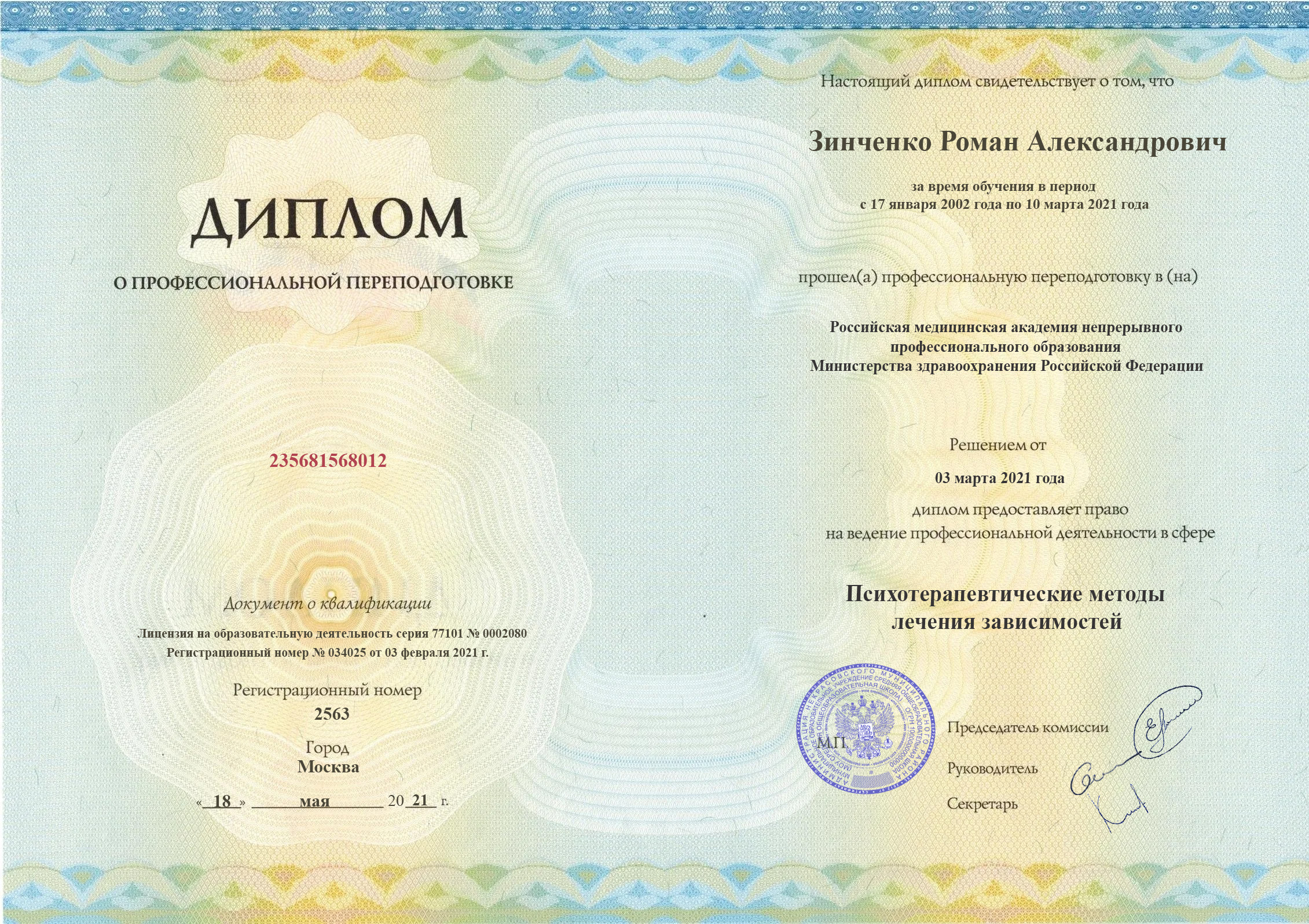 Зинченко Роман Александрович — молодой и энергичный аддиктолог, специализирующийся на лечении зависимостей. Окончил Российский университет дружбы народов в 2019 году, получив диплом по специальности «Лечебное дело». В 2020 году прошел специализацию по аддиктологии, а в 2021 году завершил переподготовку по психотерапевтическим методам лечения зависимостей.
